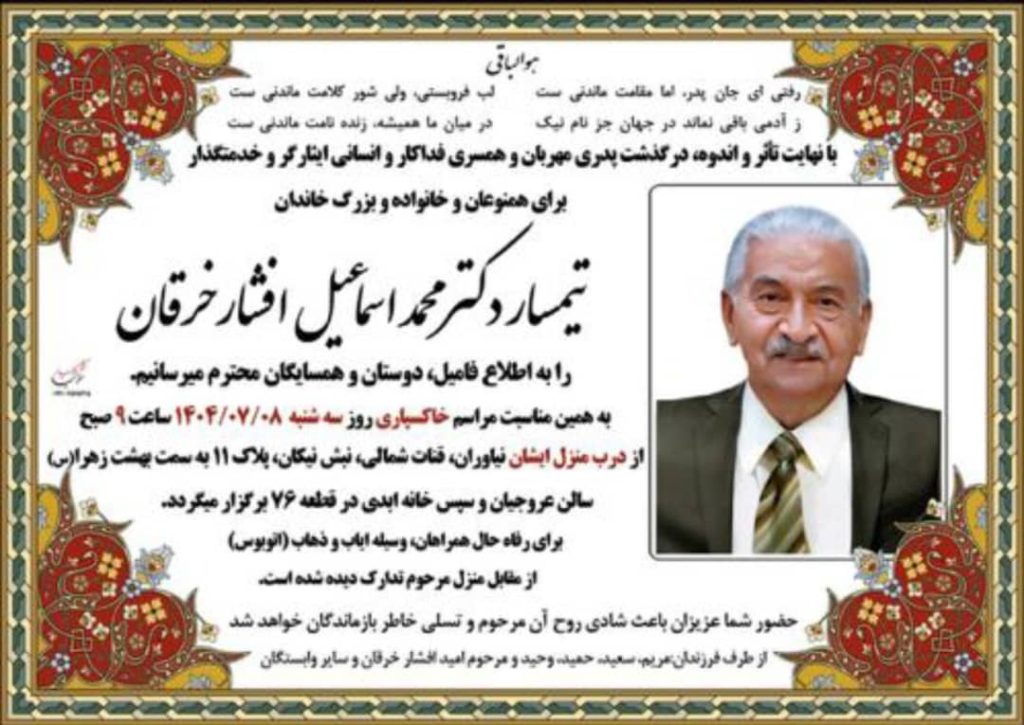 با نهایت تأسف و تأثر، درگذشت مرحوم تیمسار دکتر محمد اسماعیل افشار خرقان، انسان وارسته، خیر و نیکوکار را به بازماندگان محترم، بهویژه سرکار خانم افشار (مددکار موسسه محکم)، همچنین پروفسور حمید و پروفسور وحید (از خیرین نیکاندیش موسسه محکم) و دیگر اعضای خانواده معزز ایشان تسلیت و تعزیت عرض مینماییم.